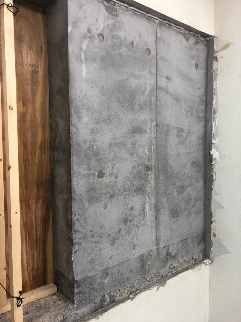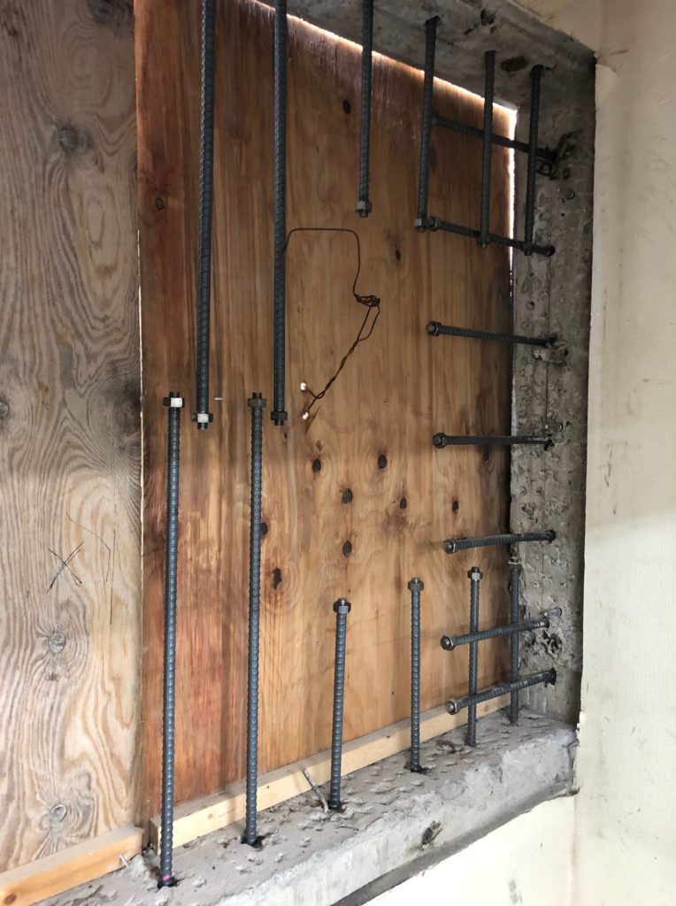 窓枠が外され開口半分だけ開口閉塞します。 あと施工アンカー打設完了後、引張試験も行いました。 その後スパイラル筋を取り付け配筋しました。 今回はコンクリートで施工ではなく、全て無収縮モルタルで施工しました。